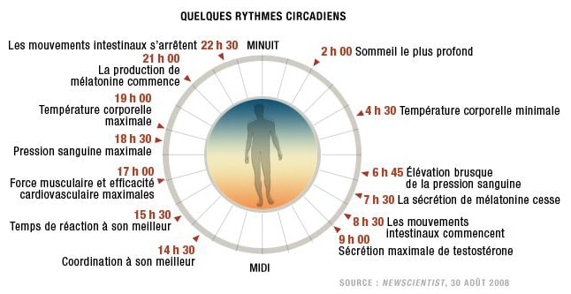 C’est notre horloge biologique qui régule le fonctionnement de notre organisme selon divers rythmes plus ou moins longs. Les rythmes de plus de 24 heures sont appelés infradiens (tel le cycle menstruel), ceux de moins de 24 heures sont nommés ultradiens (digestion, pulsations cardiaques) et, finalement, ceux qui se déroulent sur une période d’environ 24 heures sont les rythmes circadiens (sécrétion de diverses hormones, température corporelle, vigilance, performances physique et mentale).
