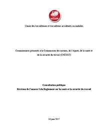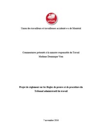 Après avoir fait un examen attentif du projet de règlement publié le 5 octobre 2016, l'uttam est intervenue afin de signifier sa très vive inquiétude face aux impacts qu’il pourrait avoir sur l’exercice des droits et recours des victimes d’accidents et de maladies du travail s’il était approuvé tel quel, particulièrement pour les travailleuses et travailleurs non-syndiqués.