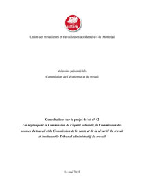 Mémoire de l'uttam sur le projet de loi n° 42. Essentiellement, l'organisation a fait valoir que les avenues qui sont proposées n'apparaissent pas être les meilleurs choix pour préserver et protéger des missions importantes de l’État et pour améliorer la qualité des services et de la justice pour les travailleuses et les travailleurs accidentés ou malades, pas plus que pour les travailleuses et les travailleurs non-syndiqués